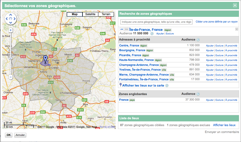 Vous pouvez également afficher ces lieux sur une carte. Cela vous permet de visualiser de manière détaillée les limites de votre zone géographique. Le nouvel outil vous permet également d'afficher les frontières de plusieurs zones géographiques sélectionnées simultanément. Vous pouvez ainsi voir quelle surface couvre la ville de Paris par exemple (la plus petite zone en bleu) par rapport à la zone couverte par l'ensemble de l'Ile de France (la plus grande zone en gris). Une fois que vous avez choisi une zone géographique, vous pouvez ajouter, exclure ou visualiser des lieux à proximité en cliquant sur les liens appropriés.