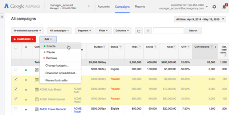 AdWords est un puissant outil de contrôle et de gestion des comptes multiples. Nous y avons apporté de superbes améliorations afin de vous faire gagner du temps et de proposer une meilleure visibilité des performances de vos comptes : gestion des campagnes multicomptes, outils puissants de génération de rapports et amélioration de la consultation des comptes.