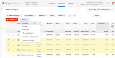 AdWords est un puissant outil de contrôle et de gestion des comptes multiples. Nous y avons apporté de superbes améliorations afin de vous faire gagner du temps et de proposer une meilleure visibilité des performances de vos comptes : gestion des campagnes multicomptes, outils puissants de génération de rapports et amélioration de la consultation des comptes.